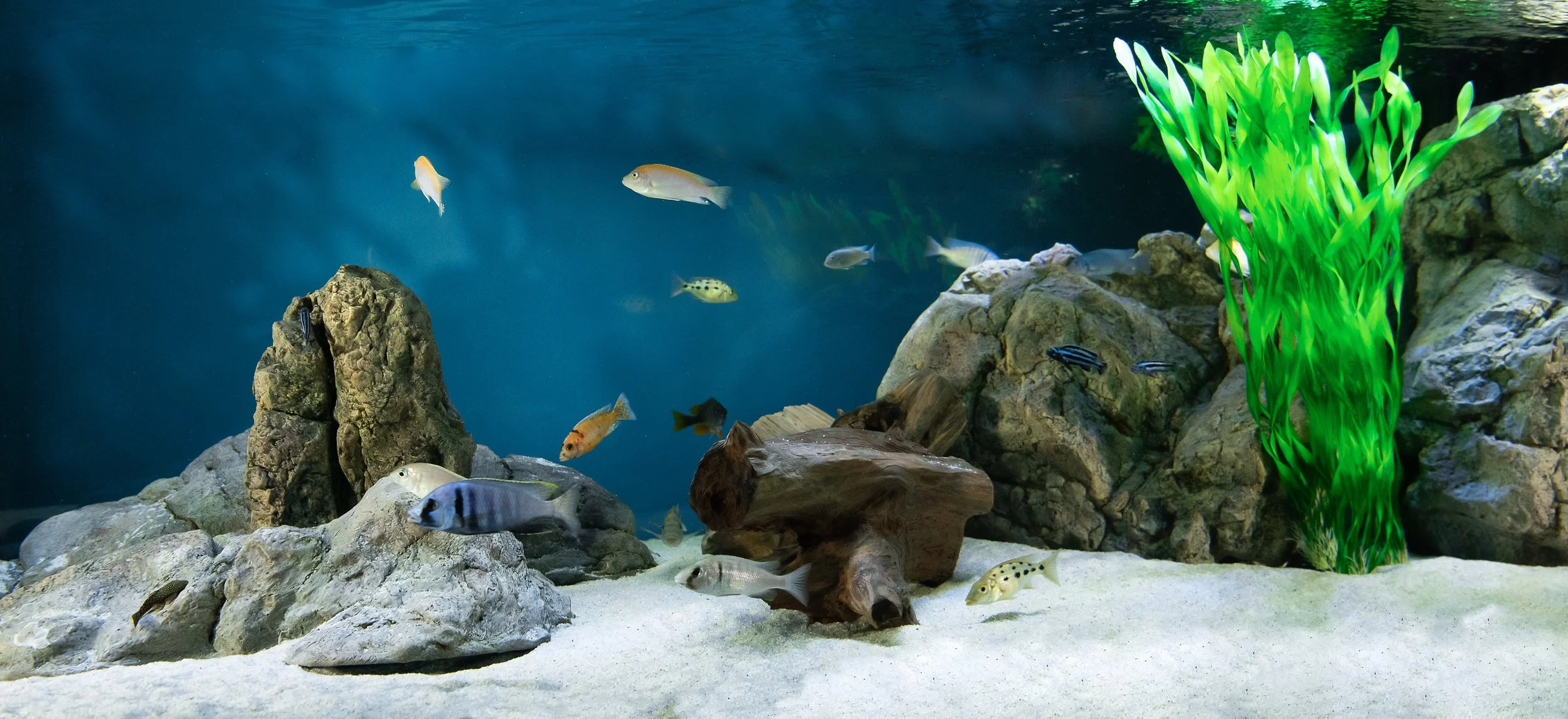 Unser Aquarium ist ein Biotop des Malawisees. Der Beckeninhalt umfasst knapp 1'500 Liter, das Gesamtgewicht der Anlage beträgt mehr als 2 Tonnen. Das Aquarium wird bewohnt von etwa 40 Buntbarschen und Welsen. Alle Fische sind Nachzuchten, also keine Wildfänge. Die Anlage wurde geplant und gebaut von Pius Fessler.
